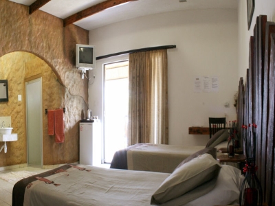 The African thatched roof adds atmosphere and all rooms are furnished in unique African style for your comfort. All rooms are furnished with television, a safe, separate bathroom with shower, cupboards, air-conditioners, fridge and mini-bar. Prices include breakfast, the use of the swimming pool and lapa area for entertainment as well as secure private parking. Standard Rooms, Suites and VIP Rooms are available. Tours and transfers also provided on request.