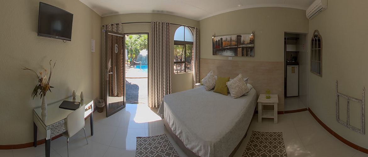 The African thatched roof adds atmosphere and all rooms are furnished in unique African style for your comfort. All rooms are furnished with television, a safe, separate bathroom with shower, cupboards, air-conditioners, fridge and mini-bar. Prices include breakfast, the use of the swimming pool and lapa area for entertainment as well as secure private parking. Standard Rooms, Suites and VIP Rooms are available. Tours and transfers also provided on request.