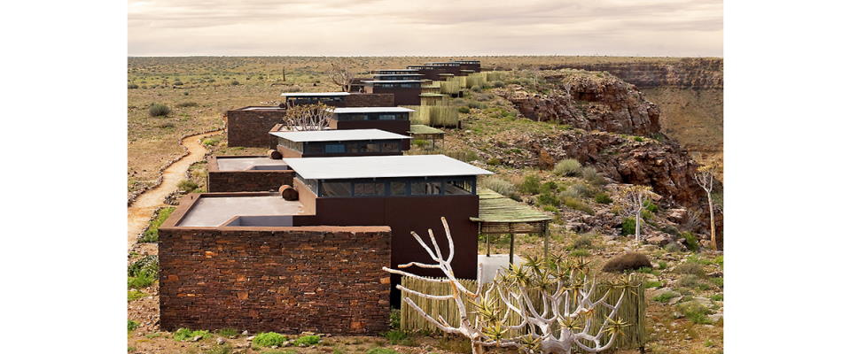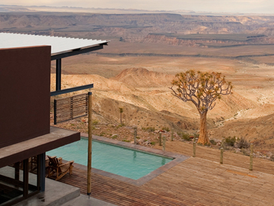 The Fish River Lodge in Namibia offers luxury accommodation in unique style. Departing from the usual colonial safari theme, the décor of the Fish River Lodge echoes the colours and textures of the surroundings. The architecture of the Fish River Lodge is minimalistic and pays homage to the grove of quiver trees around the Lodge. Many of the décor items have been manufactured by the local San and Nama population, adding to the unique experience offered at the Fish River Lodge in Namibia.