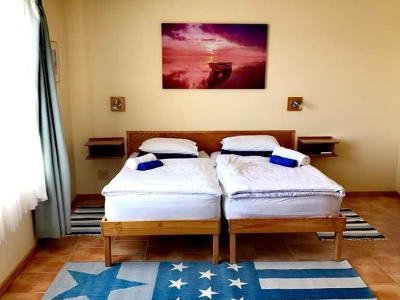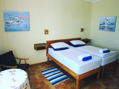 The rooms are tastefully decorated – each en suite, sea-facing and with a balcony offering panoramic views over the sea and harbour of Lüderitz. There are four double rooms (each room with two beds) as well as two self-catering (self-contained) flats with two rooms each as well as a small cooking area; ideal for families or self-catering (self-contained) guests.