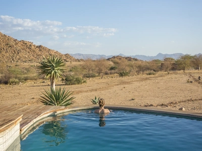 Just 7km from Solitaire, in a secluded hideaway at the foot of the Rand Mountains lies Solitaire Mountain Lodge. There are 10 ensuite rooms with air-conditioning. Each room has an outdoor seating area that overlooks the Namib landscape and there is a swimming pool to cool off. A restaurant provides delicious meals and cold drinks.