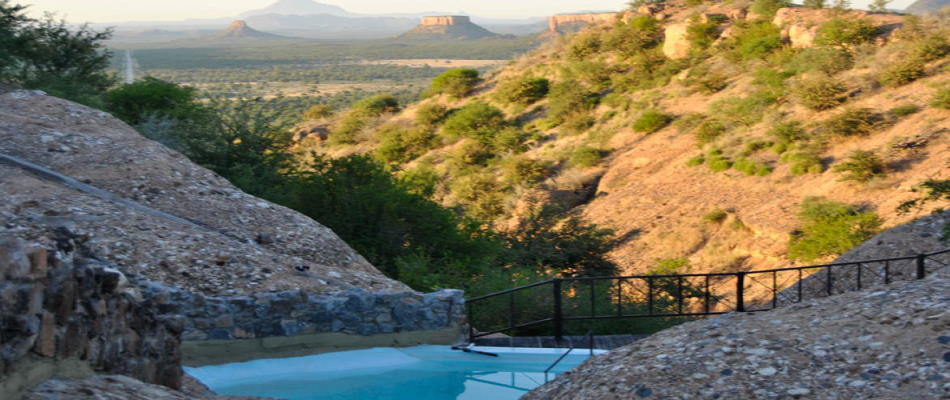 Make the Ugab Terrace Lodge your base from where you can explore this part of Namibia’s unique beauty. The lodge is conveniently situated halfway between Etosha National Park and the unique Twyfelfontein rock engravings. Swimming pools are a usual part of a guest lodge, but the swimming pool at Ugab Terrace Lodge in something to behold. Carved out of the mountain rock, you have an unspoilt view which seems to go on forever. The cuisine is likely to excite even the most jaded of palates. Chefs really go out of their way to spoil guests with gourmet meals and use plenty of fresh ingredients from the Lodge’s herb garden.
